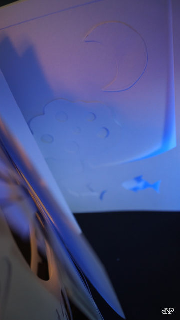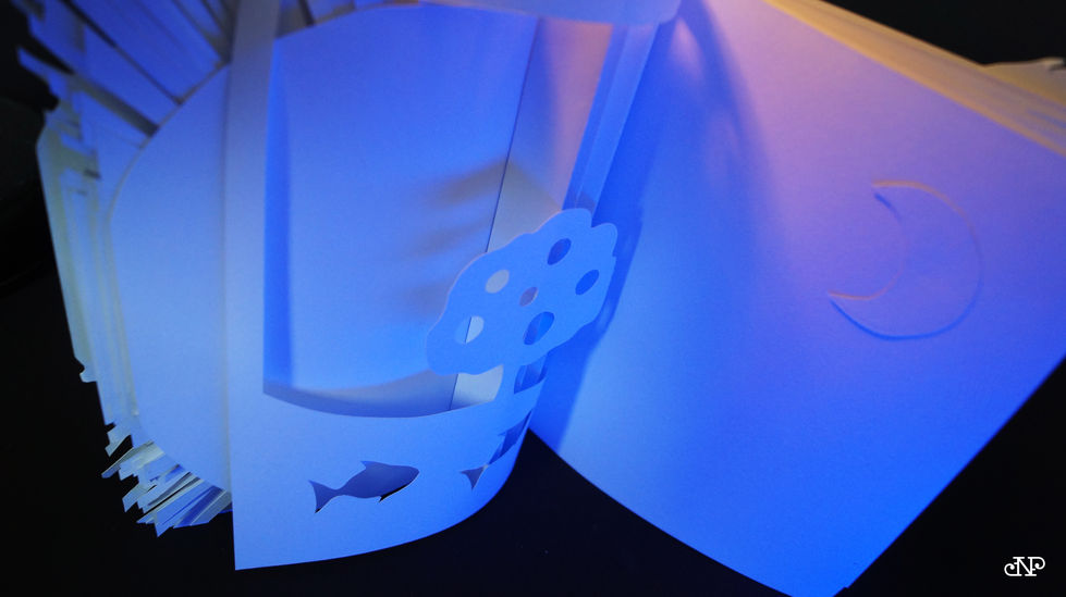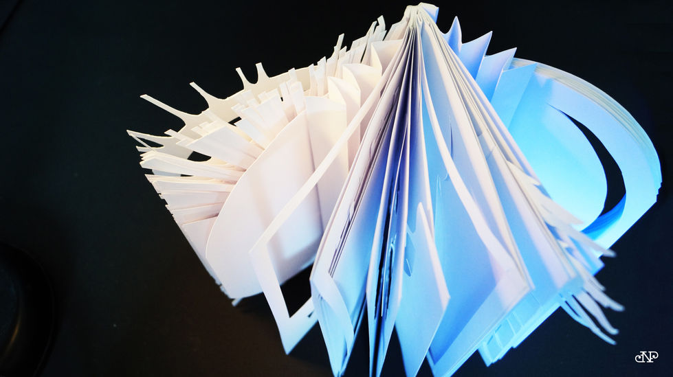 A blank white book that portrays a story. Cut-out and paper folding techniques were used.